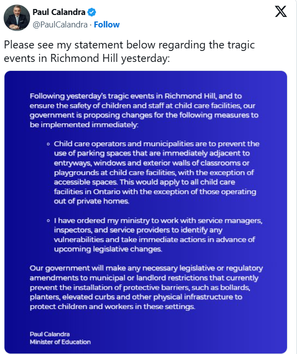 教育厅长Paul Calandra周四发表声明称,托儿机构及市政部门必须禁止在靠近出入口、窗户、教室或操场外墙的停车位停放车辆,但无障碍车位除外。他补充,这一规定不适用于私人住宅内运营的托儿服务。