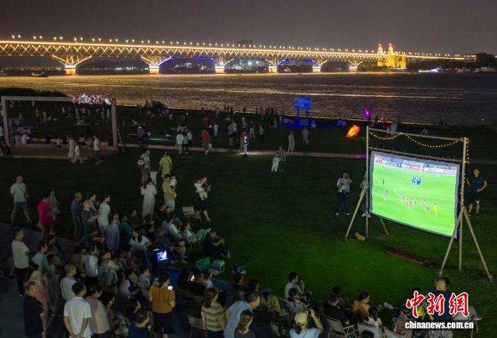 8月17日,江苏南京,市民在长江边设置的观赛点观看2025江苏省城市足球联赛(苏超)南京队主场对阵盐城队的比赛。(无人机照片) 记者 泱波 摄