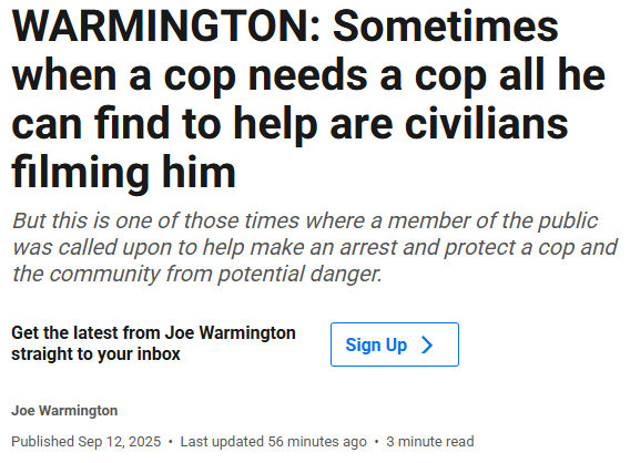 “我当然理解人们想要记录事情的冲动,但有时,我们的警察需要我们,你可能需要为了社区安全而贡献一份力量。这一次就是这样的时刻。你肯定不希望看到嫌犯抢走警官的枪和警车。”