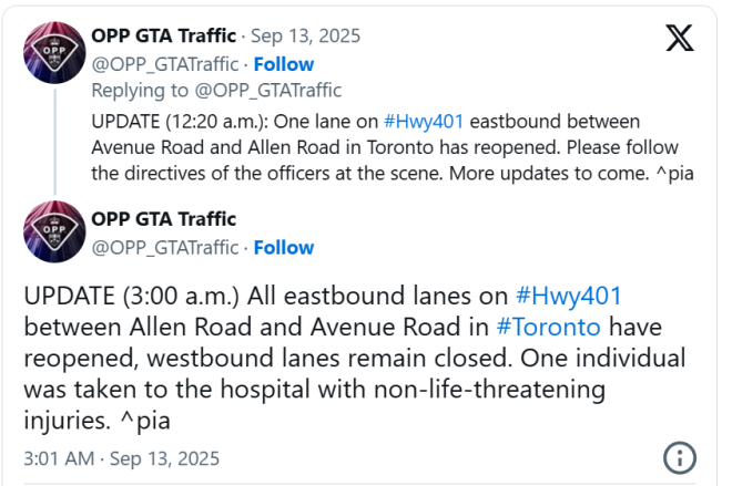 安省省警(OPP)在社交媒体上发布消息称,事发后,Allen Road与Avenue Road之间的所有车道最初都被关闭,紧急救援人员赶赴现场处理。