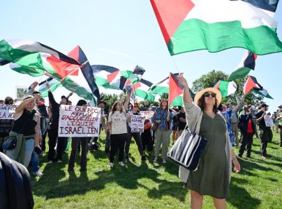 十二日週五少數親巴勒斯坦抗議者聚集在魁市自行車大獎賽現場,也是為了反對以色列-Premier Tech車隊參賽。