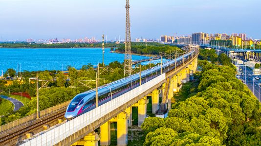 4月25日,江蘇蘇州,飛馳的京滬高鐵列車穿行在陽澄湖河段,夕陽映照成景,構成一幅美麗的夏日畫卷。視覺中國