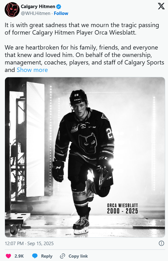 卡尔加里打猎者队也发布声明称:“我们为他的家人、朋友以及所有认识和爱他的人感到心碎。”