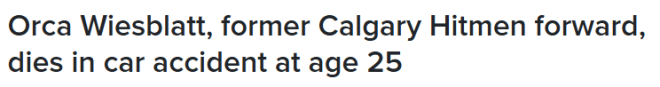 加拿大一名年仅25岁的职业冰球运动员奥尔卡·维斯布拉特(Orca Wiesblatt)在刚刚过去的周末遭遇,不幸身亡。