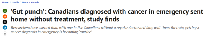 医生们指出,加拿大医疗体系存在长期低效:数百万人没有家庭医生,或者约不上医生;怀疑癌症的患者,要等上好几个月才能见到专科、做CT或活检。于是,急诊室成了他们唯一能求助的地方。