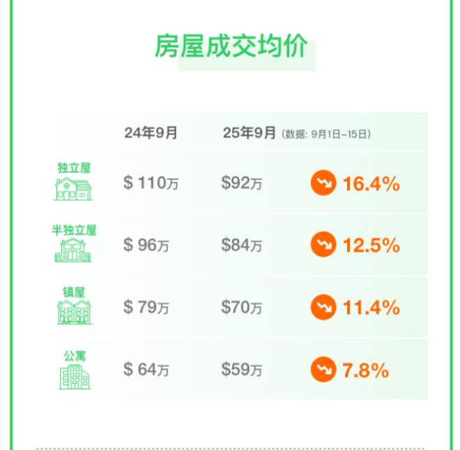 数据显示,截至9月15日,大多伦多地区所有类型房屋房价均下跌,其中独立屋平均价同比下跌16.4%,从去年9月的平均价110万元跌至今年9月的92万元,净跌12万元;半独立屋跌幅12.5%;镇屋跌幅达11.4%;公寓跌幅最小,跌7.8%。