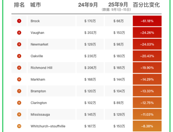 多伦多地产局 (TRREB) 发布半个月后,51找房独家发布2025年9月上半月统计数据。数据显示与去年同期相比,大多伦多地区所有类型房屋房价均下跌,而且除公寓外价格下跌都超过两位数,其中独立屋跌最狠,Brock登上跌幅榜第一名,9月上半月均价66万元,比去年同期的170万下跌61.2%,一年净跌了104万。