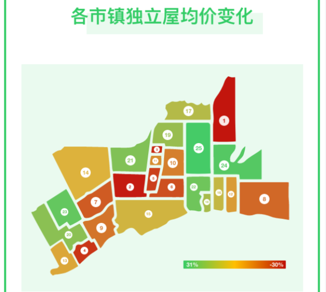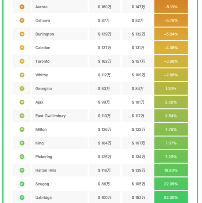位居涨幅榜第一名的是Uxbridge,涨幅52%,其后是Scugog和Haiton Hills,涨幅分别为22%和19.8%。