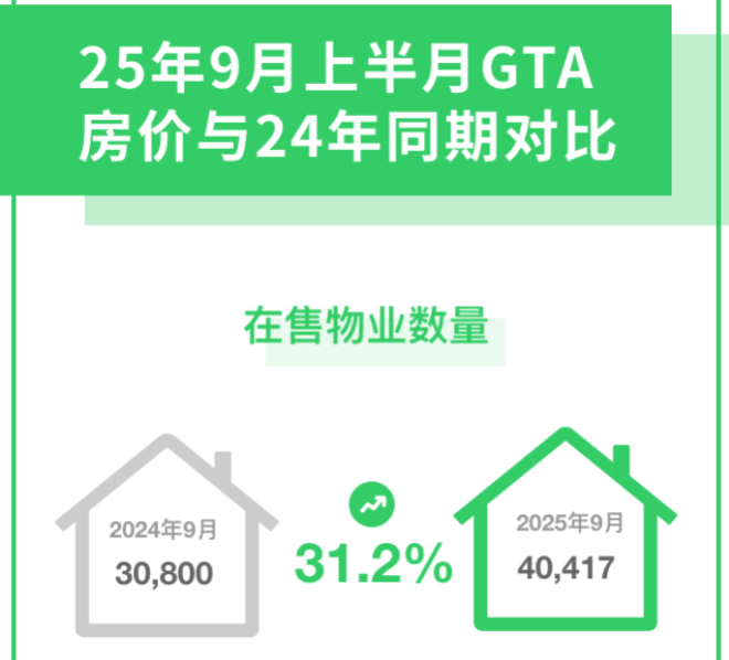 根据51找房统计数据显示,9月上半月大多伦多在售物业数量40417套,比去年同期的30800套,增加31%。