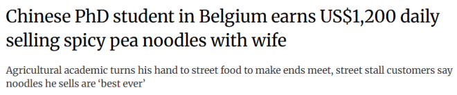 一位中国博士毕业生和他的妻子在比利时开了一家重庆小面摊,意外走红网络,日营业额超过1000欧元(约合1200美元)。