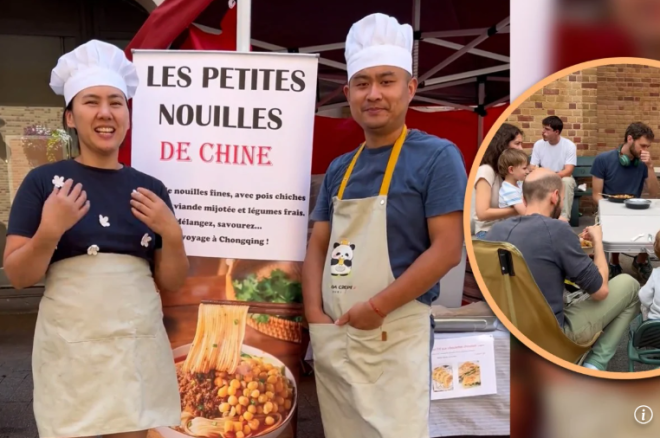 今年5月,这对夫妇开始在比利时当地的市场售卖辣味豌豆面,这是王女士的家乡重庆的特色美食。其特点是将筋道的面条、软糯的豌豆和香浓的肉酱完美结合,以其大胆咸辣的口味而闻名。为了迎合当地人的口味,王女士特意降低了辣度。