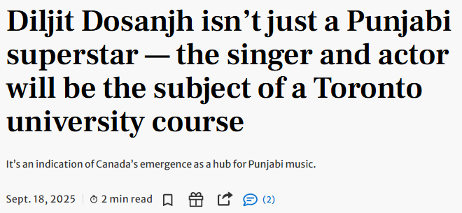 今年夏天,多伦多都会(TMU)宣布了一项前所未有的举措:从2026年秋季开始,开设一门以旁遮普超级巨星Diljit Dosanjh为主题的课程。学生将通过他的音乐和成就,研究文化如何影响全球潮流,还能强化海外侨民的认同感。