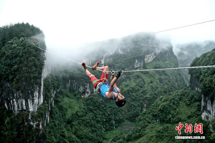 9月20日,第20届中国国际山地户外运动公开赛在重庆武隆举行。图为高空溜索比赛现场。记者 肖江川 摄