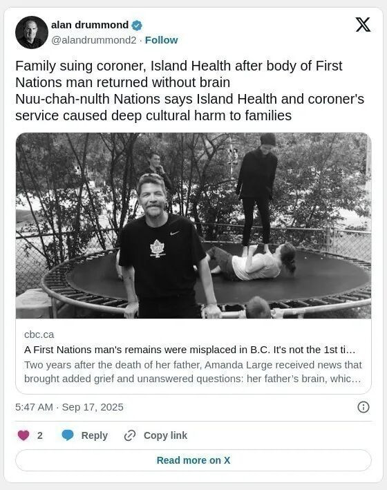 自去年秋天得知父亲的遗体情况后,拉奇及其家人一直在寻求答案。他们已对岛屿卫生局(Island Health)和BC省验尸官服务处(BC Coroners Service)提起民事诉讼。