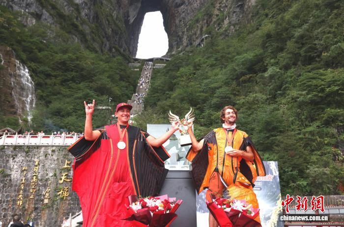 9月20日,2025年第十一届翼装飞行世界锦标赛在湖南张家界天门山落幕。图为竞速赛冠军塔希·保罗·门罗(左)和穿靶赛冠军让·雅克·沃利斯合影。周叙春 摄