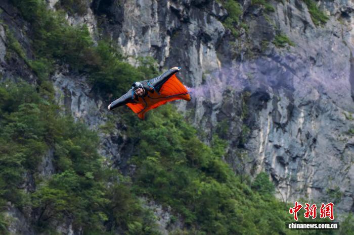 根据竞速赛规则,8名选手依次从海拔1458米的天门山玉壶峰山顶悬崖跃下,沿规定路线飞行,穿越预设旗门并绕行转向标,以穿过横亘在峡谷中的索道缆绳为终点,线路垂直落差990米、直线距离约1.3公里,用时最短者获胜。