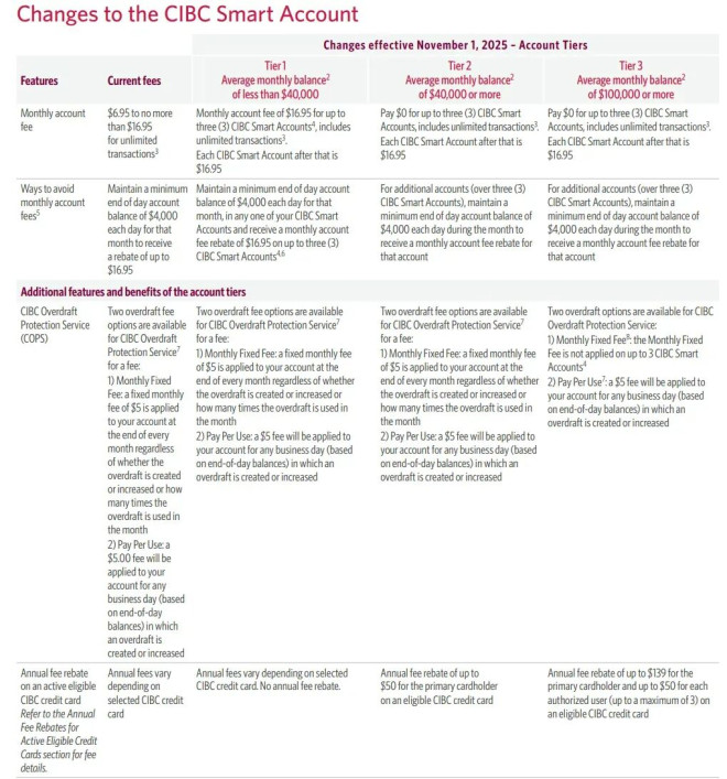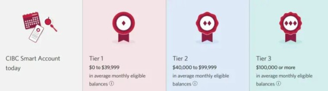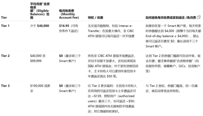 先说变化的核心。CIBC决定把Smart账户分成三个等级(Tier1/2/3),划分的标准就是你在银行的总资产,也就是在CIBC持有的支票、储蓄、投资、GIC、信托等产品的余额,不包括信用卡、贷款这些负债。系统会根据你过去两个月的平均每日余额来算,然后在每个月的前几天确认你属于哪个等级。