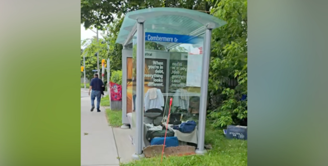今年夏天,一段14秒TikTok视频在网络疯传:在多伦多Victoria与 Ellesmere附近的Combermere Dr.公交站内,竟然摆放着一个简易床铺、衣服和一把办公椅——仿佛一个简陋的“家处”。