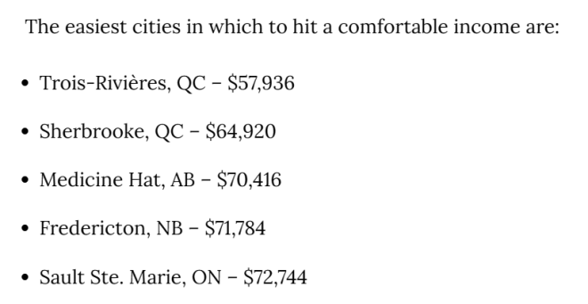 这份由MoneySense发布的报告,研究了在加拿大人口5万以上城市中,什么样的收入才能算“舒适”。