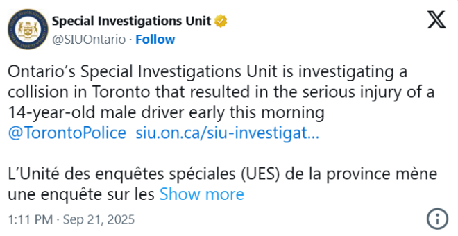 安省特别调查组(SIU)在给CP24.com的邮件中确认,这名青少年当时正在驾驶一辆汽车,并在凌晨1点前于Kingston Road和Lawrence Avenue与另一辆车相撞,事发前曾发生警察追捕。