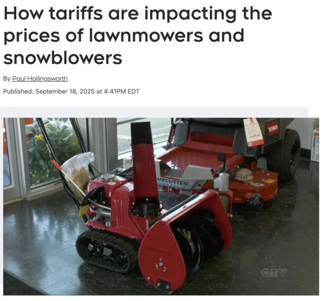 他解释说,虽然大部分割草机和吹雪机是在美国生产的,但其中大量零部件来自加拿大以及其他国家。而自今年三月起,美国对来自所有国家的钢铁和铝统一加征 25% 进口关税,导致整机成本应声上涨。