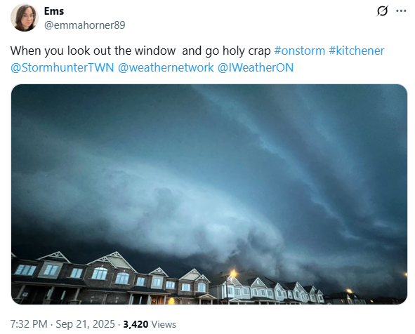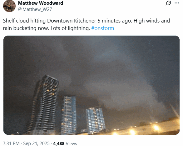 安省南部在經歷了連續幾周乾燥、悶熱的天氣之後,在周日(9月21日)晚上突然被一場極端強雷暴猛烈襲擊,從多倫多到整個GTA,再到滑鐵盧、漢密爾頓都未能倖免,宛如“天怒降臨”。