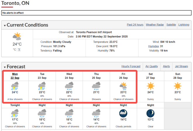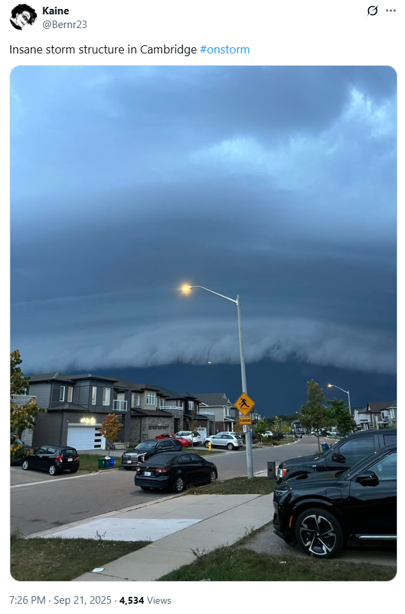 這場風暴發生在9月異常乾燥的一段時間之後。據氣象數據顯示,9月前20天,多倫多皮爾遜機場僅記錄到19.3毫米降水,遠低於季節平均的69.4毫米。也就是說,大自然已經憋了一股“情緒”,昨晚,一次性爆發了!