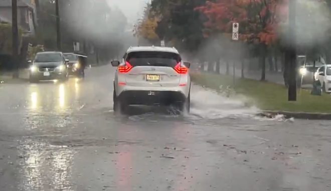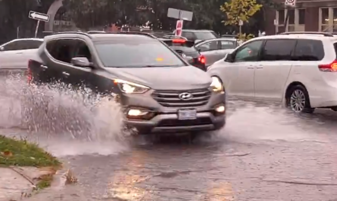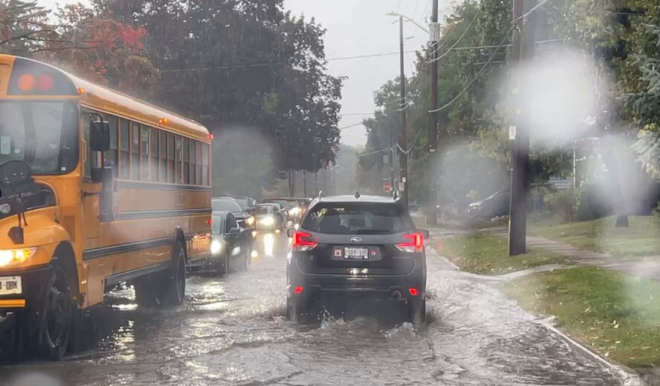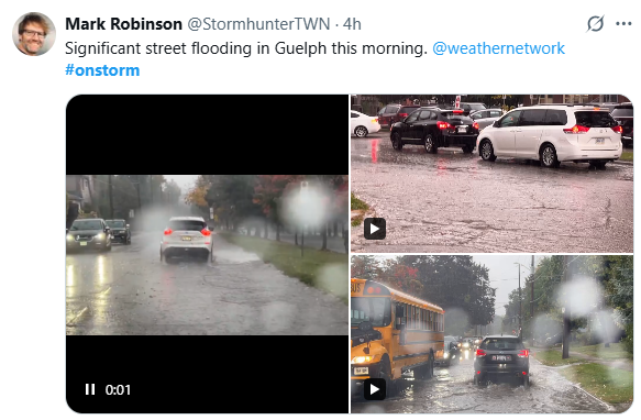 周一早上,圭爾夫多條街道出現嚴重積水,居民出行受阻。