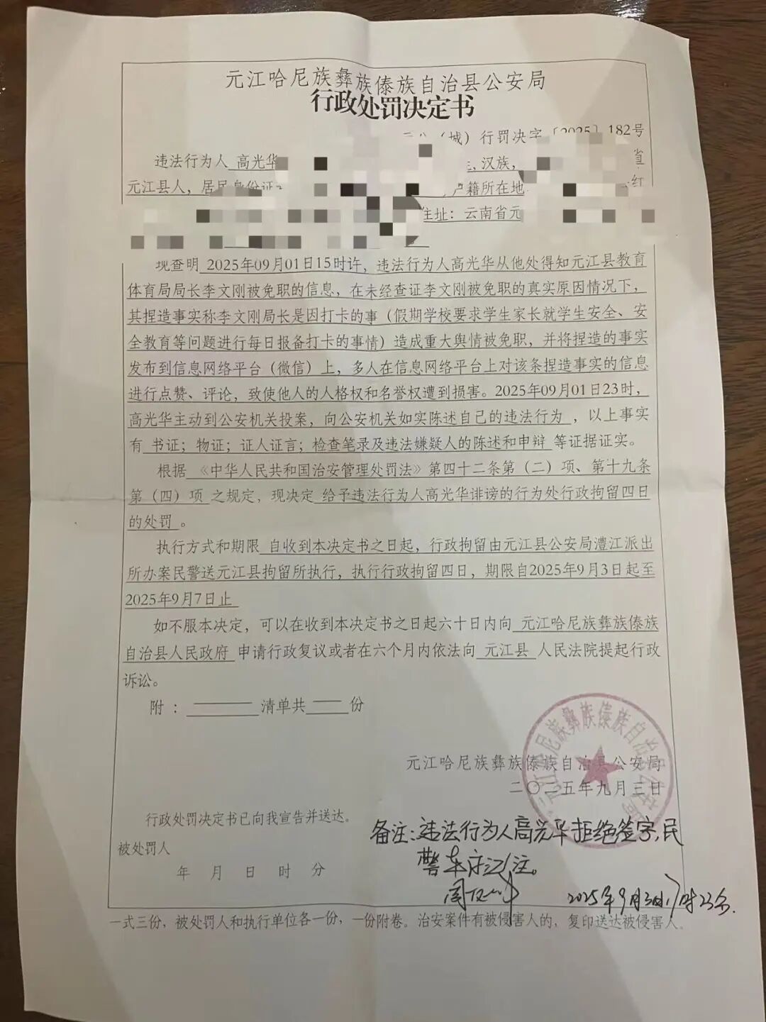 9月3日早上8时许,辖区派出所通知他,已向元江县组织部和纪委调取资料确认:李文刚的免职与打卡的事情无关,认定高光华“公然侮辱他人或者捏造事实诽谤他人”,处以行政拘留4天。