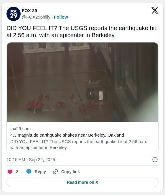 美国地质勘探局表示,地震发生在伯克利(Berkeley)东南约1英里方向。