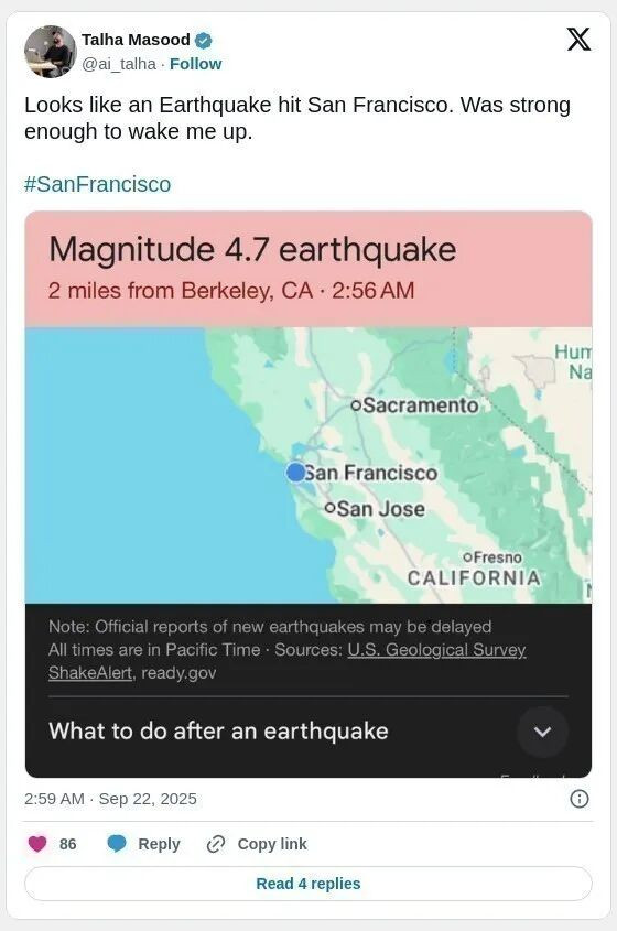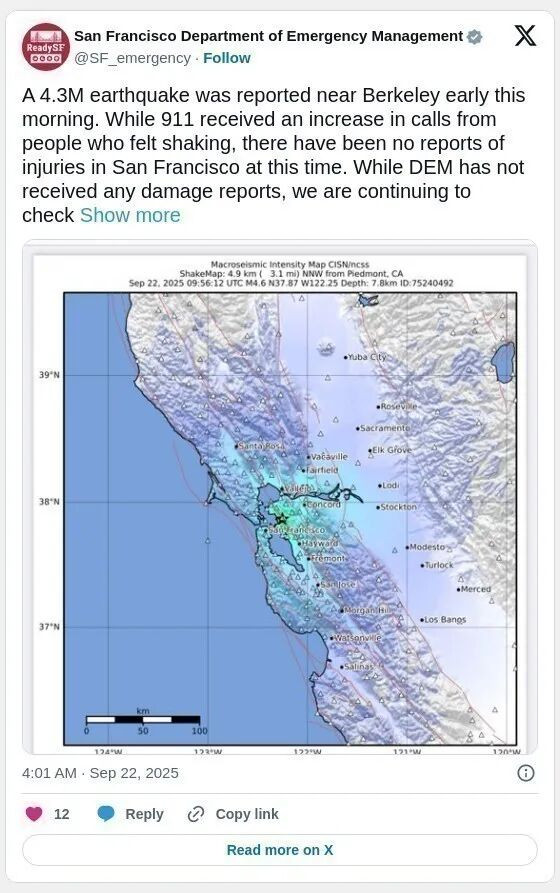 旧金山市应急管理部门在社交媒体上发布消息称,“虽然 911 接到的地震人员报警电话有所增加,但目前尚未接到旧金山人员受伤的报告”。该部门表示,尚未收到任何重大损失报告。