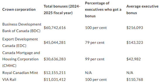 發放獎金最高的公司包括:加拿大商業發展銀行(Business Development Bank of Canada, BDC)、加拿大出口發展公司(Export Development Canada, EDC)、加拿大抵押貸款和住房公司(Canada Mortgage and Housing Corporation, CMHC)、加拿大皇家鑄幣廠(Royal Canadian Mint)和維亞鐵路(VIA Rail)。