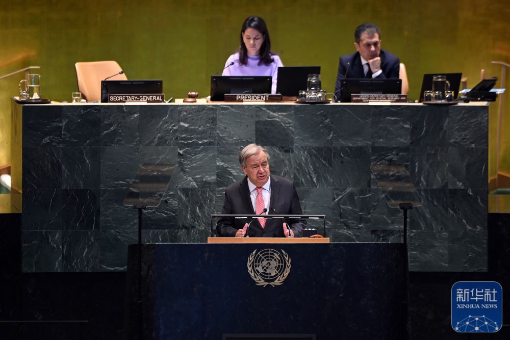 ↑9月22日,在位于纽约的联合国总部,联合国秘书长古特雷斯在纪念北京世妇会30周年高级别会议上讲话。新华社记者 李睿 摄