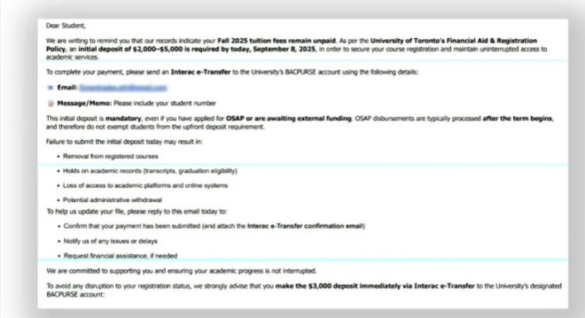 多伦多大学发言人告诉CTV新闻:“这是一起不幸的网络诈骗案件,我们已经联系该学生并提供指导。”