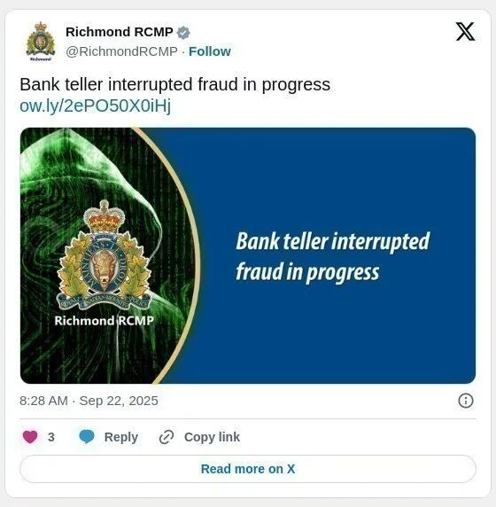 9 月 11 日,一名老年受害者提取了一大笔现金,正前往商场与某人见面,随后,一名出纳员向列治文皇家骑警报案。