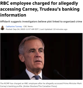 今天周三(9月24日),加拿大皇家騎警證實起訴了RBC皇家銀行的一名員工,因對方涉嫌獲取加拿大現任總理馬克·卡尼和前總理杜魯多的銀行賬戶資料。