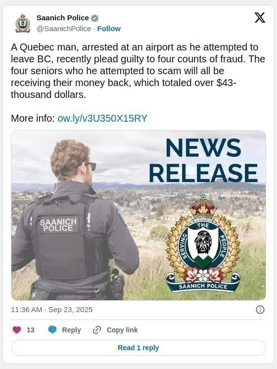 萨尼奇警方周二宣布,一名魁北克男子因针对温哥华岛老年人实施而被判有罪,老年人因此损失了数万加元。