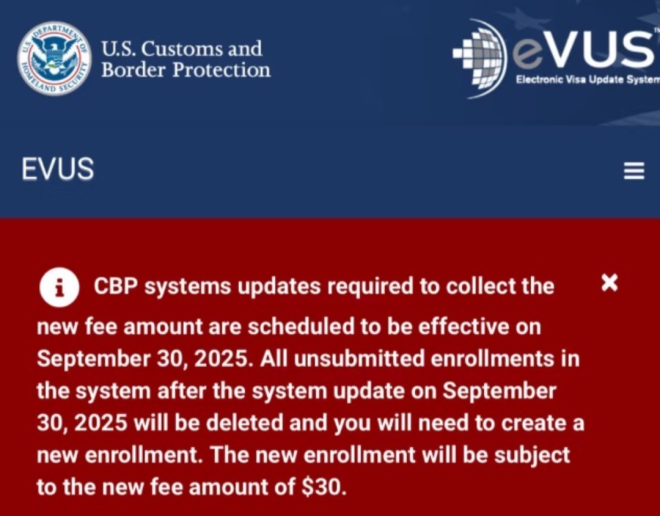 自 2025年10月1日 起,美国海关与边境保护局(CBP)将正式对EVUS(签证更新电子系统)登记收取费用。