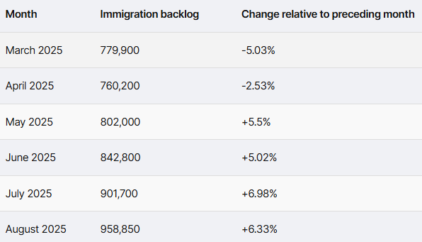 截至8月31日,加拿大、难民及公民事务部(IRCC)的待处理申请积压数量为 958,850 份。
