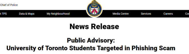 多伦多警方提醒公众,近期有针对多伦多大学学生的网络钓鱼诈骗事件。
