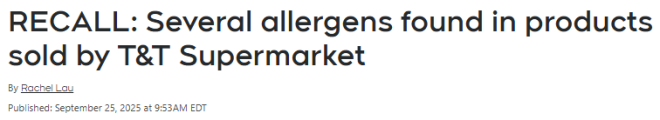 根据魁省农业、渔业与食品部(MAPAQ)通报,蒙特利尔两家大统华(T&T)销售的多款产品因未申报含有多种过敏原而被召回。