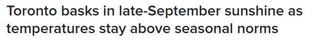 然而,本周天气却完全不同。由于晴朗干燥且气温高于季节平均值,多伦多人将体验到更像是夏末而非初秋的天气。