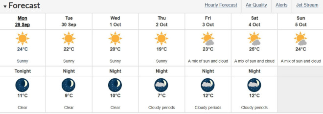 白天气温预计:周一24℃,周二22℃,周三20℃,周四19℃。预计到周末气温会回升至25℃,且没有降雨预报。