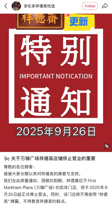 近日,万锦广场一家中式糕点店也选择了关闭店铺。9月26日,小红书@多伦多祥德斋优选发布通知,因租约到期,祥德斋关闭万锦广场的实体门店,9月25日正式停业。