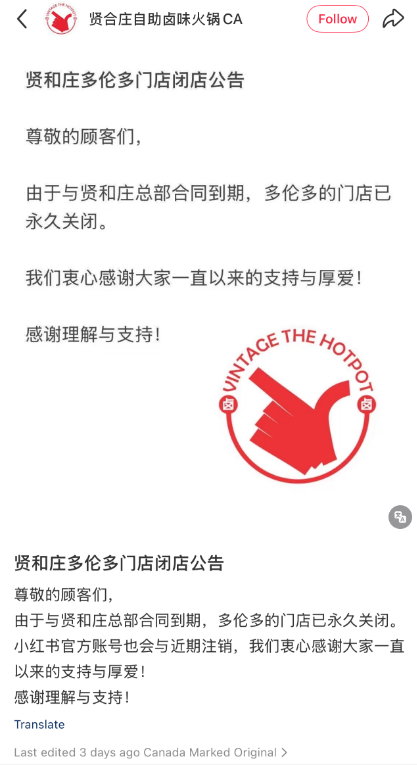9月25日,小红书@贤合庄自主卤味火锅发出一张闭店公告:由于和贤合庄总部合同到期,多伦多的门店已永久关闭。