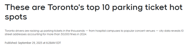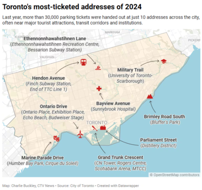 根据城市数据,停车管理集中在一些主要目的地周围,而这些地方的停车位需求往往远超供应。总的来说,多伦多每年约开出280万张停车罚单。去年,有57个地址各自开出了超过1,000张罚单,总计近10万张。