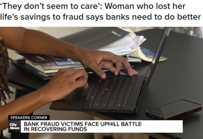 CityNews的报道称,丰业银行拒绝回应她的具体指控,仅在声明中表示:“丰业银行非常重视诈骗案件,并不断提醒客户不要向任何人泄露密码、银行卡、PIN码或账户信息。”