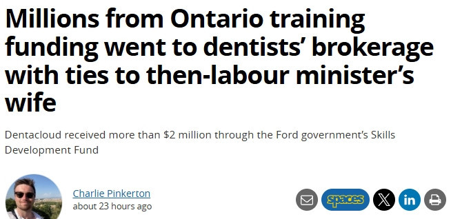 一家牙科经纪公司Dentacloud从福特政府拿到超200万加元的培训基金后,被曝出与时任劳工厅厅长的妻子有交集,公司CEO还向进步保守党捐款逾2万元。随着牙科联合会解散、项目审计即将出炉,这笔“纳税人钱”正引发巨大质疑。