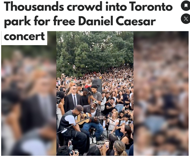 在刚刚过去的周末,多伦多Queen West街区突然变得异常热闹,街道上人潮汹涌,交通几乎瘫痪,Trinity Bellwoods公园更是人山人海,人们不约而同地朝着同一个方向奔跑,只因为——Daniel Caesar来了!