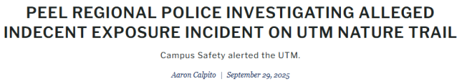2025年9月19日(周五)下午5:38, 多伦多大学通过其警报系统向全体师生员工发布了一则紧急通知:UTM自然步道(UTM Nature Trail)疑似发生猥亵暴露事件。